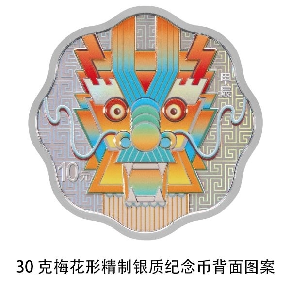 30克梅花形銀質(zhì)紀念幣背面圖案為裝飾龍造型,襯以回紋紋飾。