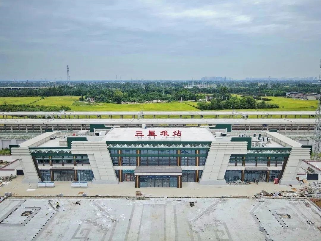 三星堆站位于廣漢市南興鎮(zhèn)與向陽(yáng)鎮(zhèn)交界處,距離三星堆遺址約5公里。