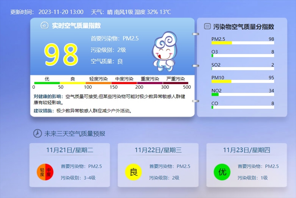央視網(wǎng)消息:據(jù)@北京環(huán)境監(jiān)測 消息,11月20日13時的實(shí)時空氣質(zhì)量指數(shù),北京目前的污染級別達(dá)到2級,東城、西城、朝陽、豐臺、通州、房山、大興等區(qū)已顯示為輕度污染。