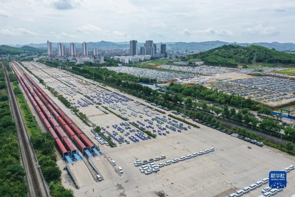 這是位于廣西柳州市的雒容汽車物流基地,一些出口的新能源汽車從這里裝車運(yùn)往各大出海港口(7月19日攝,無人機(jī)照片)。新華社記者 曹祎銘 攝