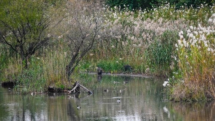 野豬和水鳥(niǎo)生活在長(zhǎng)江新濟(jì)洲(11月13日攝)。記者 季春鵬 攝