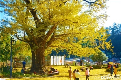 2023年11月25日,安徽安慶,響腸鎮(zhèn)請(qǐng)水寨村千年銀杏樹披“金甲”,進(jìn)入最佳觀賞期,吸引游客前來游玩賞景。