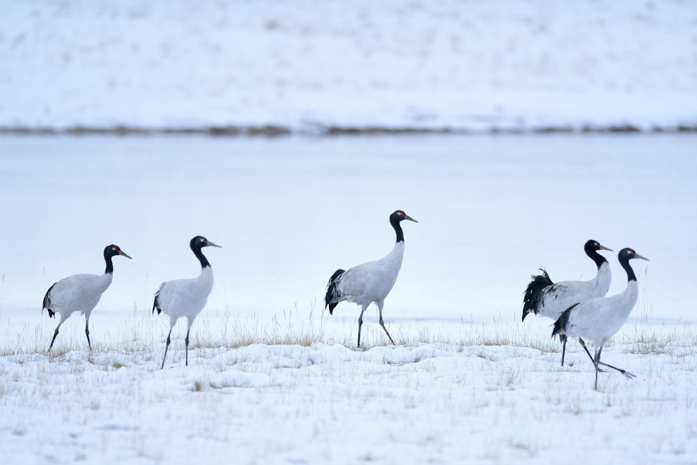 位于青海省的三江源國家公園黃河源園區(qū)內(nèi)的黑頸鶴(2021年10月21日攝)。