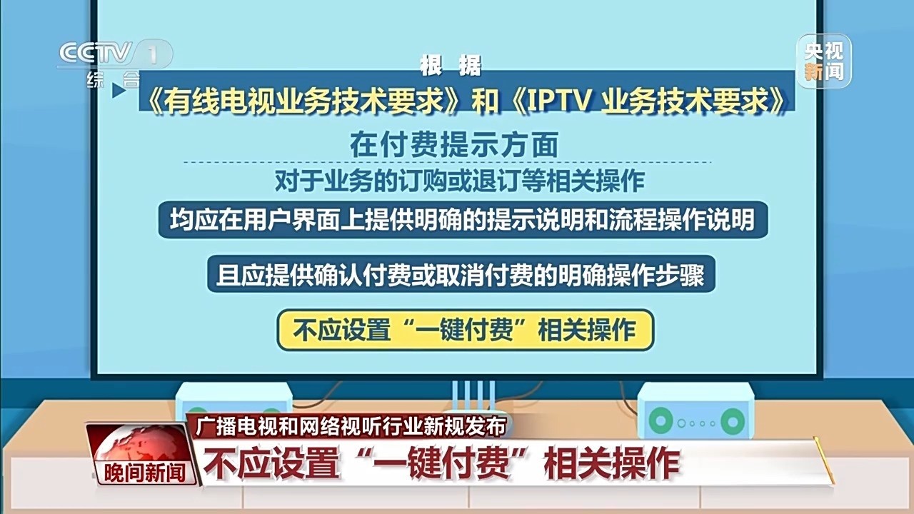 在付費(fèi)提示方面,對(duì)于業(yè)務(wù)的訂購(gòu)或退訂等相關(guān)操作,均應(yīng)在用戶界面上,提供明確的提示說(shuō)明和流程操作說(shuō)明,且應(yīng)提供確認(rèn)付費(fèi)或取消付費(fèi)的明確操作步驟,不應(yīng)設(shè)置“一鍵付費(fèi)”相關(guān)操作。此外,有線電視和IPTV遙控器應(yīng)具備快捷看直播頻道的按鍵,通過(guò)此按鍵直接進(jìn)入全屏直播,按鍵名稱應(yīng)為“看電視”。