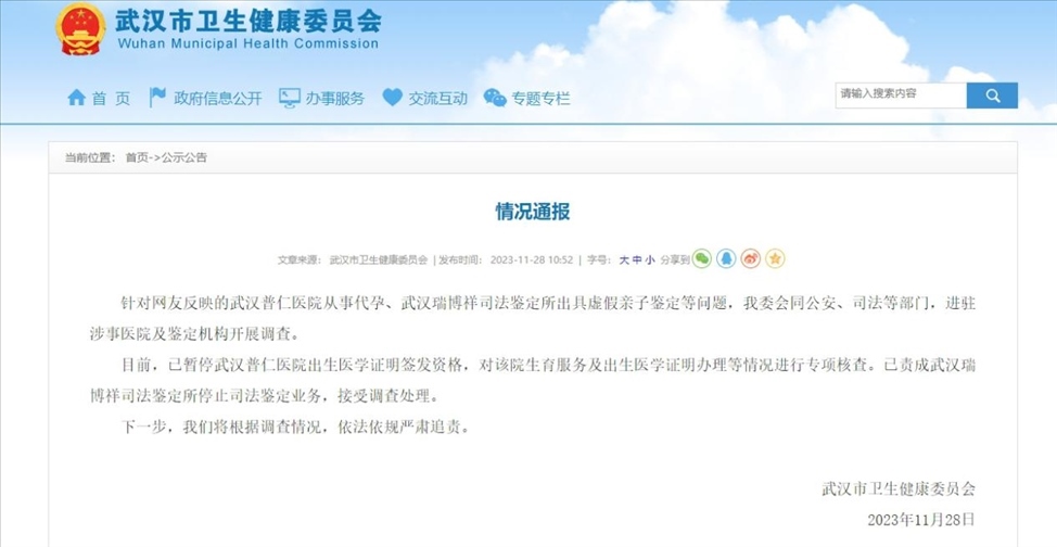 ·武漢衛(wèi)健委通報“普仁醫(yī)院從事代孕、武漢瑞博祥司法鑒定所出具虛假親子鑒定”情況。