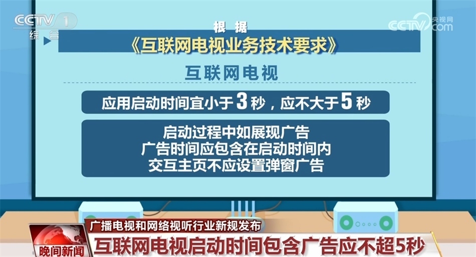 根據(jù)《互聯(lián)網(wǎng)電視業(yè)務技術要求》,互聯(lián)網(wǎng)電視應用啟動時間宜小于3秒,應不大于5秒,啟動過程中如展現(xiàn)廣告,廣告時間應包含在啟動時間內。交互主頁不應設置彈窗廣告。交互主頁應設置顯著、便捷的免費業(yè)務專區(qū)入口。在付費提示方面,互聯(lián)網(wǎng)電視對于業(yè)務的訂購或退訂等相關操作不應設置“一鍵付費”,對于任何業(yè)務的定期或連續(xù)扣費,均應在扣費前明確、主動提示用戶。