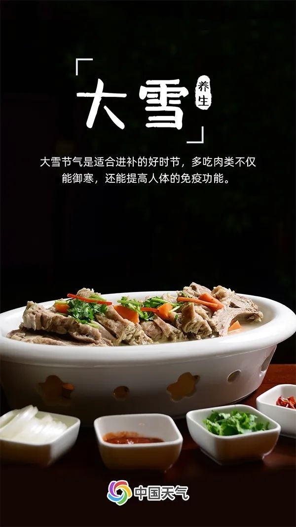 大雪也是適合進(jìn)補(bǔ)的好時(shí)節(jié)。冬天的寒冷為放肆吃肉提供了充足的理由,肉類不僅能為我們的身體提供足夠的熱量以抵御嚴(yán)寒,還能提高人體的免疫功能,促進(jìn)新陳代謝。不過,進(jìn)補(bǔ)也要有“度”,除了吃肉,也要適當(dāng)吃一些新鮮的水果和蔬菜,做到營養(yǎng)均衡。