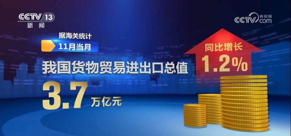 央視網(wǎng)消息:海關(guān)總署今天(12月7日)對外公布,今年11月份,我國貨物貿(mào)易進(jìn)出口總值3.7萬億元,同比增長1.2%。數(shù)據(jù)顯示,我國外貿(mào)穩(wěn)中向好態(tài)勢進(jìn)一步鞏固。