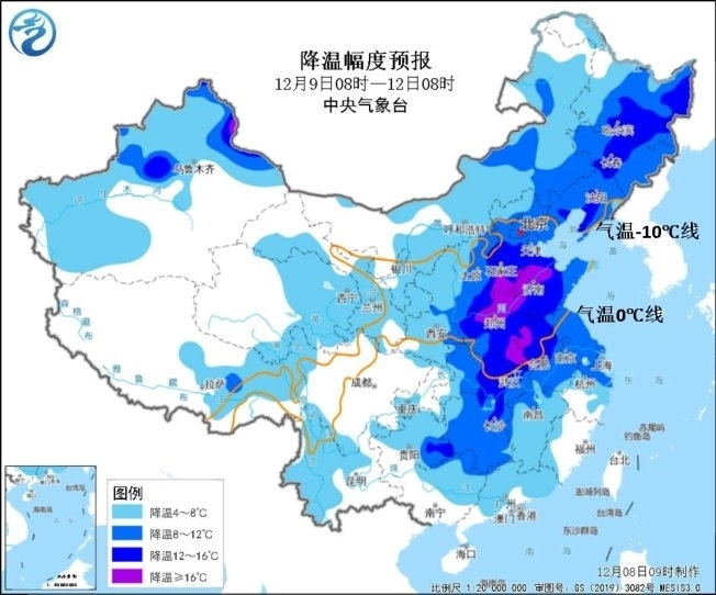大風(fēng)降溫預(yù)報:預(yù)計9日至11日,受較強冷空氣影響,東北地區(qū)、華北、黃淮、江漢、江淮、江南西部和北部等地氣溫下降6~10℃,東北地區(qū)中部、華北南部、黃淮等地降溫幅度可達12℃以上;12日早晨,最低氣溫0℃線將南壓到湖北中部至蘇皖北部一帶。期間,長江以北大部地區(qū)有4~6級偏北風(fēng),陣風(fēng)7~8級;渤海、黃海、東海海域有5~7級風(fēng)、陣風(fēng)8~9級。