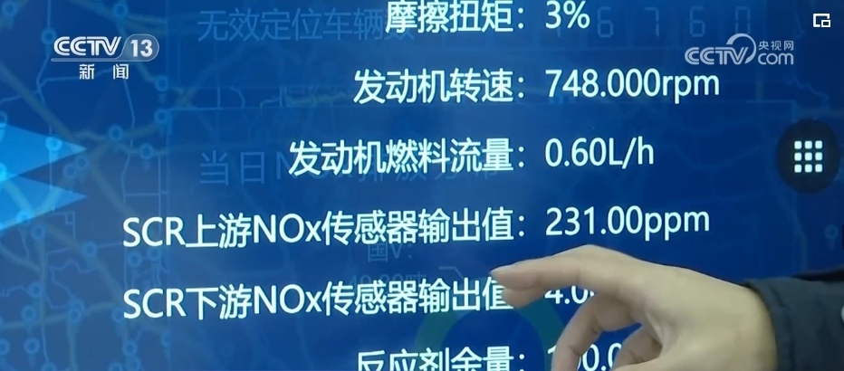 在另外一間實(shí)驗(yàn)室,這塊大屏幕連接著全國(guó)308萬國(guó)6柴油車,每輛車發(fā)動(dòng)機(jī)的工作狀態(tài)和污染物的排放裝置是否正常運(yùn)行一目了然。