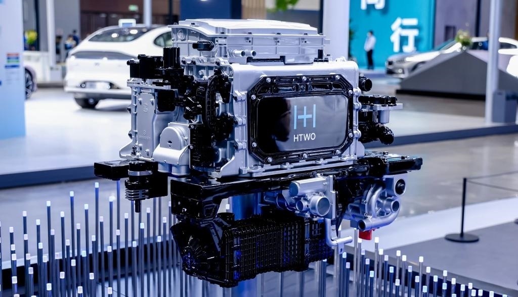 ?在2023世界新能源汽車(chē)大會(huì)技術(shù)展區(qū),車(chē)企展示的一款氫燃料電池系統(tǒng)。新華社記者夏天 攝