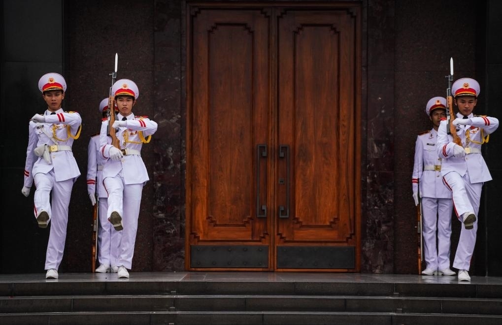 在河內(nèi)地標(biāo)巴亭廣場一側(cè),坐落著胡志明陵和胡志明故居。記者抵達(dá)廣場時(shí),守衛(wèi)胡志明陵的儀仗兵正在舉行換崗儀式,眾多民眾和游客高舉相機(jī)或手機(jī),記錄下這莊嚴(yán)肅穆的一刻。胡志明陵北側(cè)的胡志明故居內(nèi),各國游客排起長隊(duì),在他曾長期居住和工作的高腳屋下駐足留影。