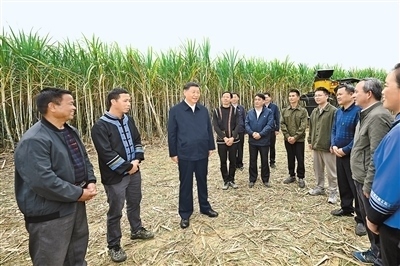 14日下午,習(xí)近平到來賓市考察調(diào)研。在國家現(xiàn)代農(nóng)業(yè)產(chǎn)業(yè)園黃安優(yōu)質(zhì)“雙高”糖料蔗基地,習(xí)近平察看萬畝甘蔗林和機械化作業(yè)收割場景,聽取基地情況介紹。他走進(jìn)甘蔗林,詳細(xì)了解甘蔗良種繁育技術(shù)要領(lǐng),同蔗農(nóng)、農(nóng)機手和農(nóng)技人員親切交流。習(xí)近平指出,廣西是我國蔗糖主產(chǎn)區(qū),要把這一特色優(yōu)勢產(chǎn)業(yè)做強做大,為保障國家糖業(yè)安全、促進(jìn)蔗農(nóng)增收致富發(fā)揮更大作用。要積極培育和推廣良種、提高機械化作業(yè)水平,建設(shè)好現(xiàn)代農(nóng)業(yè)產(chǎn)業(yè)園。要探索建立更加穩(wěn)定的利益聯(lián)結(jié)機制,讓廣大農(nóng)民共享農(nóng)村改革和發(fā)展成果。他祝愿鄉(xiāng)親們的生活像甘蔗一樣甜蜜。