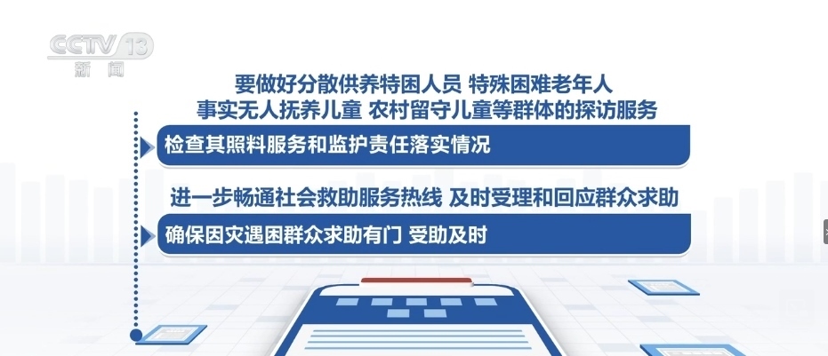 要做好分散供養(yǎng)特困人員、特殊困難老年人、事實無人撫養(yǎng)兒童、農(nóng)村留守兒童等群體的探訪服務(wù),檢查其照料服務(wù)和監(jiān)護責任落實情況。進一步暢通社會救助服務(wù)熱線,及時受理和回應(yīng)群眾求助,確保因災(zāi)遇困群眾求助有門、受助及時。