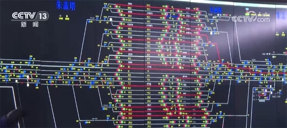 總臺(tái)央視記者 張叢婧:我現(xiàn)在是來(lái)到了車(chē)站的行車(chē)指揮室,可以看到這塊大屏幕上實(shí)時(shí)顯示著車(chē)站的列車(chē)狀態(tài),中間這些紅色的線(xiàn)就代表著此時(shí)軌道上正在有列車(chē)作業(yè)或者等待作業(yè),左邊這些紅色線(xiàn)就意味著現(xiàn)在有列車(chē)正在進(jìn)站。