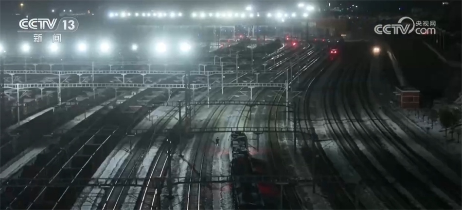 總臺(tái)央視記者 張叢婧:我這一下來(lái),明顯感覺(jué)到冷了特別多,現(xiàn)在司機(jī)師傅就在這準(zhǔn)備做換車(chē)頭的工作。工作人員告訴我,在這個(gè)編組站里,現(xiàn)在幾乎每隔10分鐘就會(huì)有一列車(chē)編好組往外發(fā)出。我在車(chē)站里走了一會(huì),就感覺(jué)已經(jīng)要被凍透了,大家可以看一下,現(xiàn)在這里的溫度是有零下將近24攝氏度。