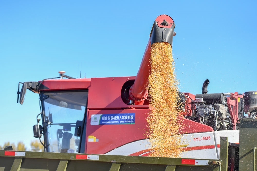 在中國(guó)科學(xué)院“黑土糧倉(cāng)”科技會(huì)戰(zhàn)長(zhǎng)春示范區(qū)公主嶺示范基地,無人駕駛農(nóng)機(jī)將收獲的玉米裝車(2023年10月19日攝)。新華社記者 張楠 攝