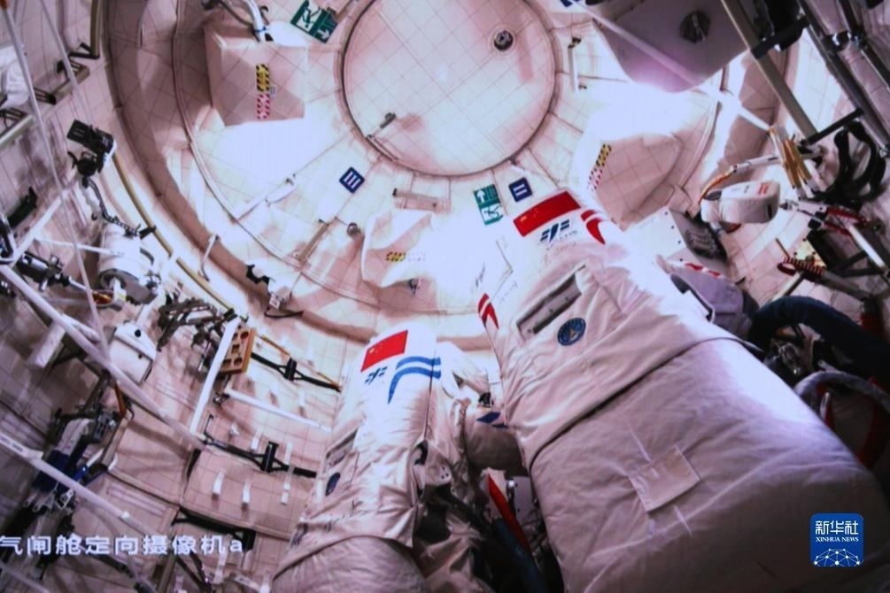 12月21日在北京航天飛行控制中心拍攝的神舟十七號航天員湯洪波(右)、唐勝杰返回問天實驗艙并關閉艙門的畫面。新華社發(fā)(韓啟揚攝)