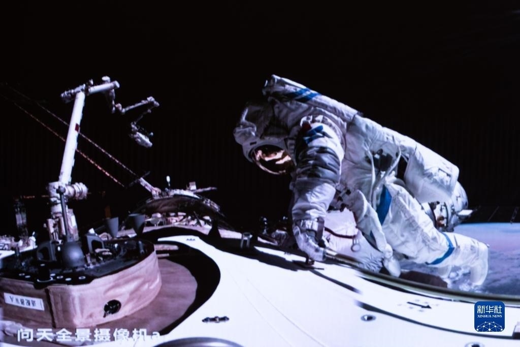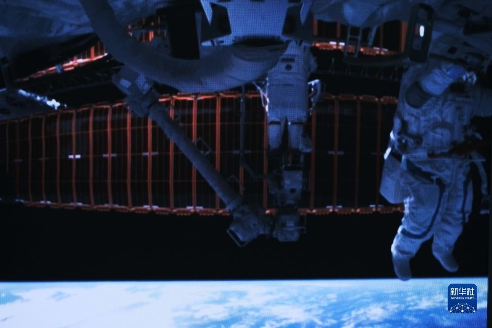 12月21日在北京航天飛行控制中心拍攝的神舟十七號航天員湯洪波開展艙外操作的畫面。新華社記者 李杰 攝