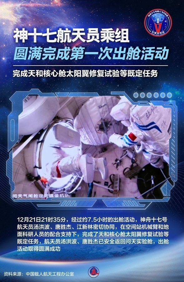 據(jù)中國載人航天工程辦公室介紹,21日21時35分,經(jīng)過約7.5小時的出艙活動,神舟十七號航天員湯洪波、唐勝杰、江新林密切協(xié)同,在空間站機械臂和地面科研人員的配合支持下,完成了天和核心艙太陽翼修復試驗等既定任務,航天員湯洪波、唐勝杰已安全返回問天實驗艙,出艙活動取得圓滿成功。