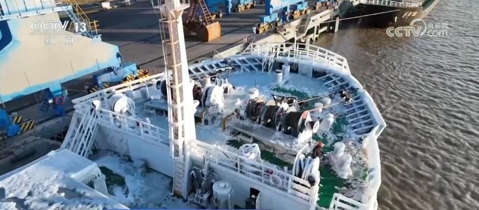 總臺央視記者 張叢婧:大家可以看到,現(xiàn)在船上掛滿了一層冰棱,非常堅(jiān)硬,現(xiàn)在甲板上特別滑,走路的時(shí)候要非常注意。