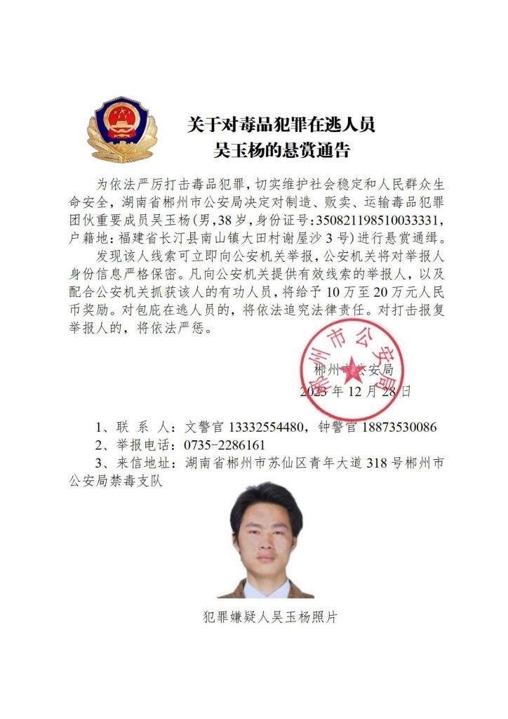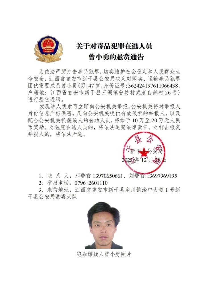 其中,湖南省郴州市公安局決定對(duì)張安龍、馬文祥、吳玉楊進(jìn)行公開懸賞通緝;湖南省株洲市公安局決定對(duì)楊金梅進(jìn)行公開懸賞通緝;江西省新干縣公安局決定對(duì)曾小勇、李國(guó)平、孫強(qiáng)進(jìn)行公開懸賞通緝;浙江省溫州市公安局決定對(duì)顏歡平進(jìn)行公開懸賞通緝;四川省遂寧市公安局決定對(duì)母朝東進(jìn)行公開懸賞通緝;貴州省黔東南州公安局決定對(duì)龍華進(jìn)行公開懸賞通緝。