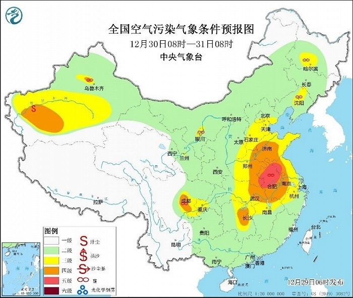 今天至30日白天,將是本次霧和霾天氣過(guò)程影響最重的時(shí)段,預(yù)計(jì)華北中南部、黃淮中西部、汾渭平原、江漢、四川盆地等地將有輕至中度霾,其中,天津、河北中南部、山東西部、河南北部等地有重度霾。29日夜間至30日的早晨至上午時(shí)段,華北中南部、黃淮、江淮等地的部分地區(qū)仍有大霧天氣,今天18時(shí)將繼續(xù)發(fā)布大霧預(yù)警。
