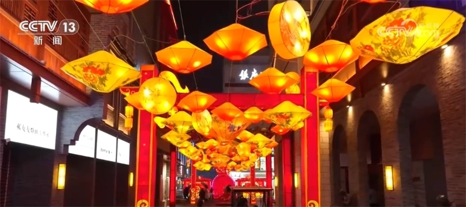 在江蘇南京熙南里街區(qū),大紅燈籠高高掛,來(lái)往游客和市民穿梭其間逛市集、品美食,感受節(jié)日氣氛。