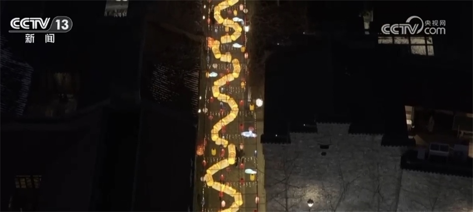 在老門東景區(qū),從空中俯瞰,一條長(zhǎng)130多米的龍燈貫穿在巷子里,蜿蜒盤旋點(diǎn)亮了城市夜空。