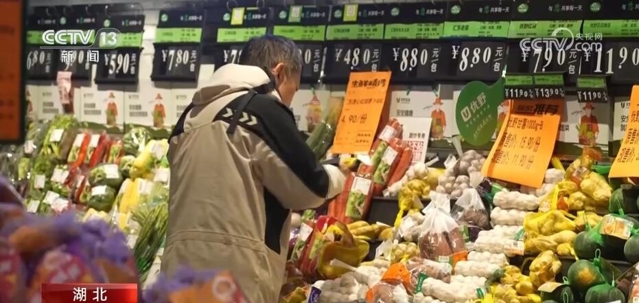 在湖北武漢的一家連鎖超市內(nèi),記者看到新鮮蔬菜、水果、肉品、糧油等商品準(zhǔn)備充足,不少人在選購。