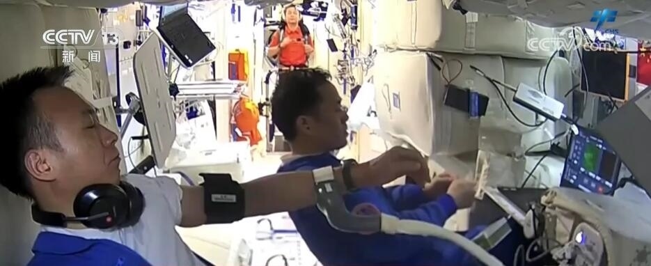 這張圖片展現(xiàn)的是神舟十七號乘組近期開展航天醫(yī)學領(lǐng)域?qū)嶒灥膱鼍?,在隊友湯洪波和江新林的幫助下,航天員唐勝杰穿戴起實驗儀器,進行下肢運動學測試實驗。