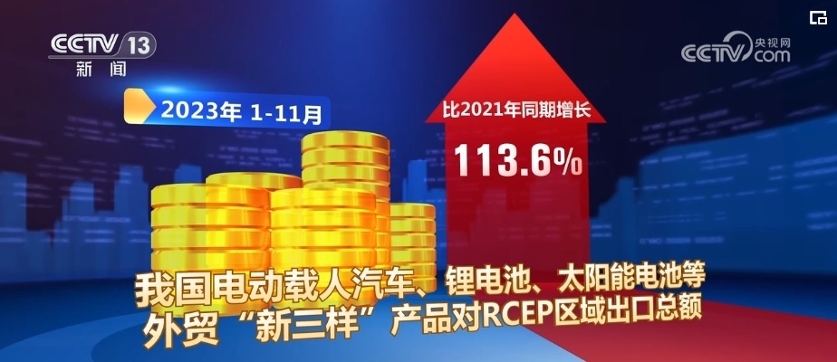 2023年1—11月,中國對RCEP成員國的中間品出口,比2021年同期增長17.4%,中國成為區(qū)域內(nèi)最大的中間品貿(mào)易國。2023年1—11月,我國電動載人汽車、鋰電池、太陽能電池等外貿(mào)“新三樣”產(chǎn)品對RCEP區(qū)域出口總額,比2021年同期增長113.6%。