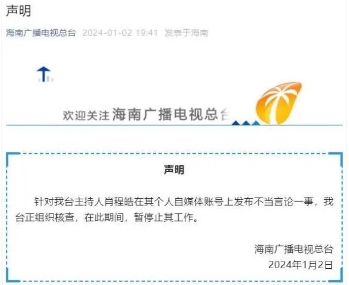 ·海南一主持人在自媒體發(fā)布不當(dāng)言論,被暫停工作。