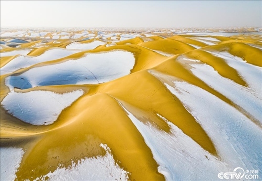 新疆巴音郭楞蒙古自治州,雪后的塔克拉瑪干沙漠,黃沙與白雪相互交融,美景如畫(huà)。