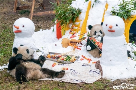 重慶動(dòng)物園,大熊貓“渝可”“渝愛(ài)”在雪中擼串,享受新年美好時(shí)光。