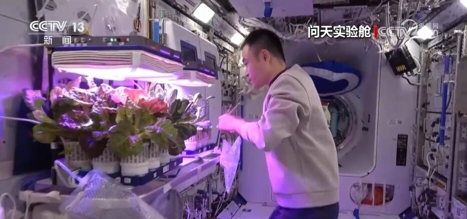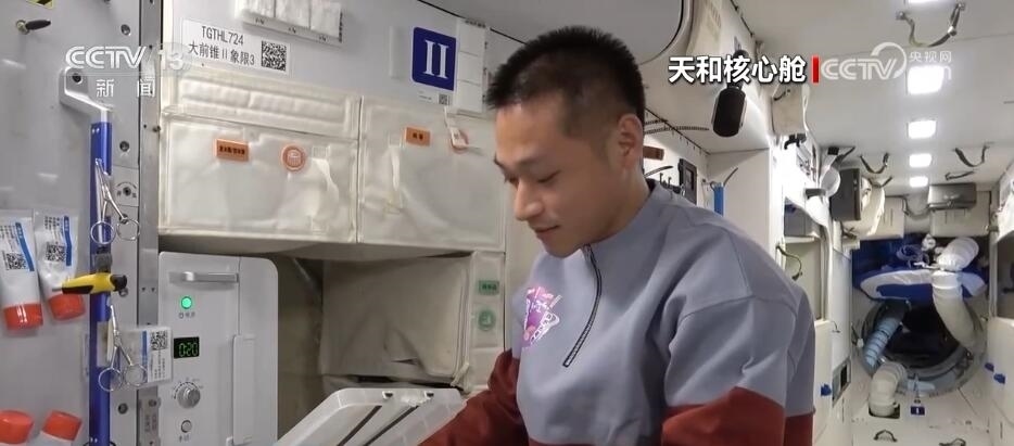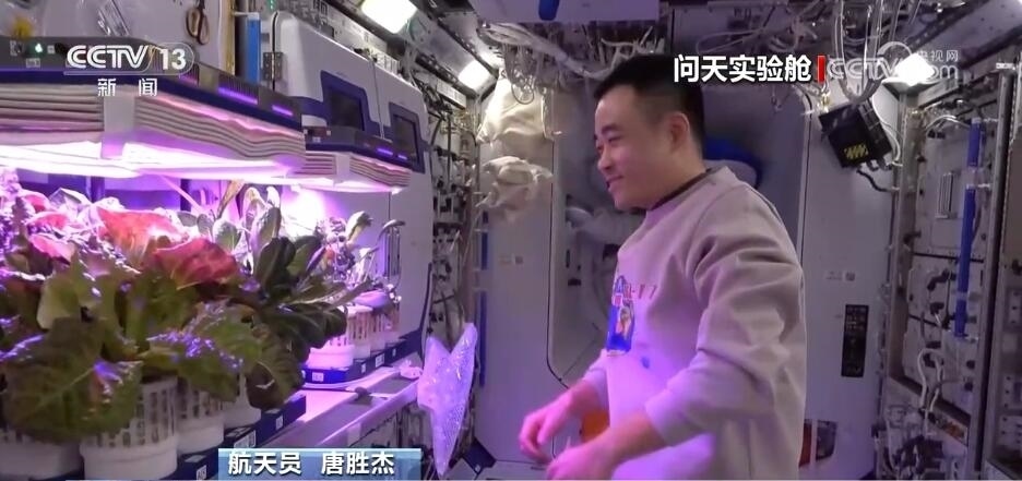 航天員 唐勝杰:你好,我正在對(duì)我們的櫻桃番茄進(jìn)行授粉。因?yàn)樘諞]有小蜜蜂,我就是那只小蜜蜂。大家看一看,這是我們的太空蔬菜,神十七乘組在“太空出差”期間,我們的太空菜園變得更大了,大家看看我們的蔬菜是不是長(zhǎng)勢(shì)喜人?今天是新年的第一天,江新林為我們準(zhǔn)備了營(yíng)養(yǎng)豐盛的太空午餐,但是我覺得今天應(yīng)該再增加一點(diǎn)綠色的、新鮮的蔬菜,午餐就會(huì)變得更豐盛了。大家可以看一看,看看我們的櫻桃番茄。誒,拿這兩杯,今天中午我們就吃這兩杯。