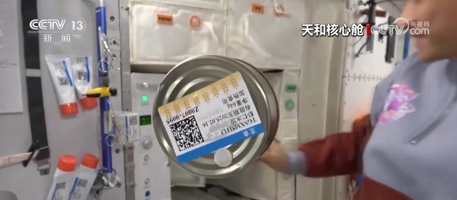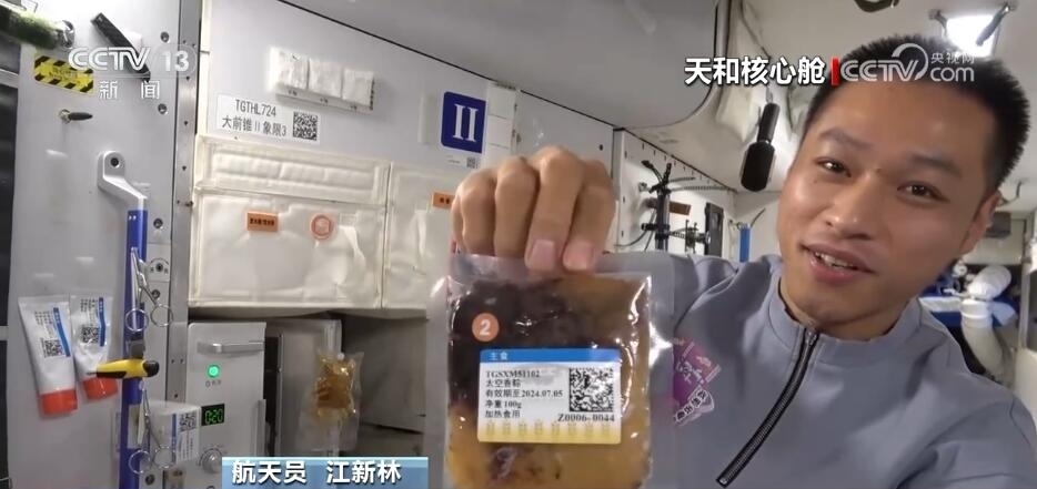 航天員 江新林:我是今天的太空美食家,讓我?guī)ьI(lǐng)大家一起來探索發(fā)現(xiàn)今天的太空美食。我們先看一下主食,熱乎乎的,看看里面都有什么吧,有01最愛吃的白米飯,小心燙哦,02愛吃的面條,我的炒飯。好了,把它粘在餐桌上。然后再讓我們看看我為他們準(zhǔn)備的驚喜??纯催@是什么?這是我們冬至特意結(jié)余的餃子,還有蔬菜副食。地面上的工作人員考慮得特別周到,按照個(gè)人的口味為我們準(zhǔn)備了美味的食品,而且將它們塑封包裝,給我們節(jié)余時(shí)間的時(shí)候又保證它的口味。這是網(wǎng)紅太空香粽,大家印象比較深刻吧,還有這個(gè)年糕也是特別好吃、特別美味,還有紅燴豬排,保證有足夠的蛋白質(zhì)攝入量。很豐盛。請(qǐng)看這里,我們特意留了一些新鮮的水果,看看都有什么吧,有美味的蘋果,還有葡萄,大家這個(gè)都特別愛吃,我們?nèi)齻€(gè)在一起分享一下。