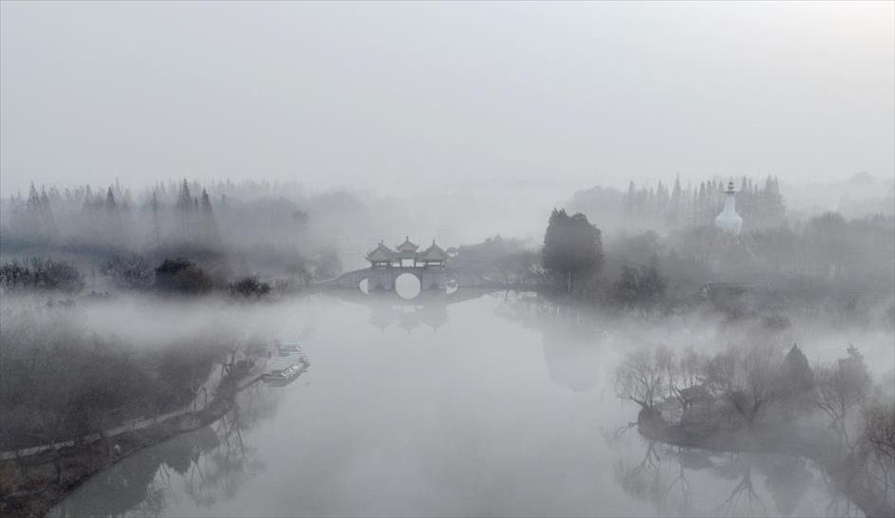2024年1月6日,江蘇揚州,瘦西湖風(fēng)景區(qū)在晨霧中若隱若現(xiàn),宛如一幅水墨畫卷,美不勝收。