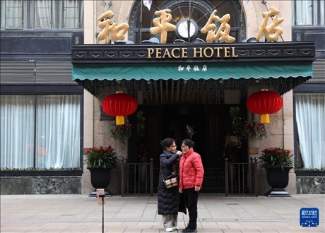 1月9日,市民在南京東路上的和平飯店前整理服裝,準(zhǔn)備自拍。新華社記者 劉穎 攝
