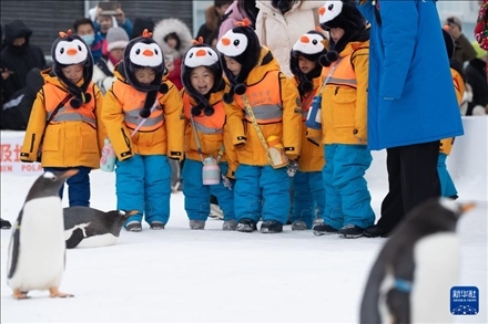 1月6日,在哈爾濱極地公園,“小砂糖橘”與企鵝進(jìn)行互動(dòng)。新華社記者 張濤 攝
