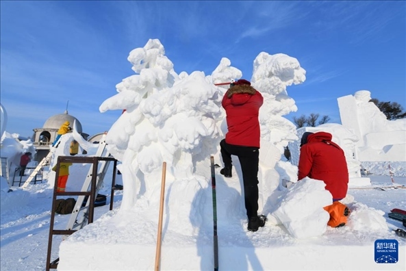 1月8日,選手在太陽(yáng)島雪博會(huì)園區(qū)內(nèi)制作雪雕。新華社記者 王松 攝