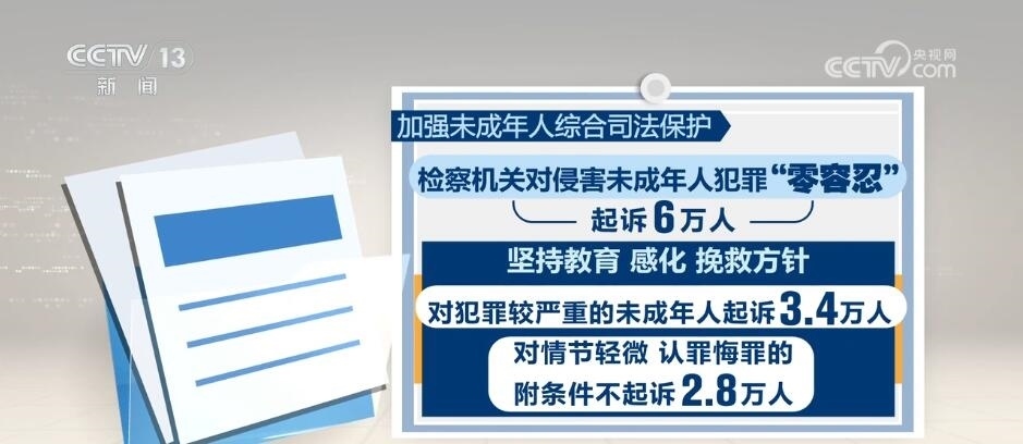 加強(qiáng)未成年人綜合司法保護(hù)。檢察機(jī)關(guān)對(duì)侵害未成年人犯罪“零容忍”,起訴6萬人。堅(jiān)持教育、感化、挽救方針,對(duì)犯罪較嚴(yán)重的未成年人起訴3.4萬人;對(duì)情節(jié)輕微、認(rèn)罪悔罪的,附條件不起訴2.8萬人。部署加強(qiáng)犯罪預(yù)防工作,推動(dòng)罪錯(cuò)未成年人分級(jí)干預(yù),協(xié)調(diào)推動(dòng)專門學(xué)校建設(shè),依法矯治有嚴(yán)重不良行為的未成年人。