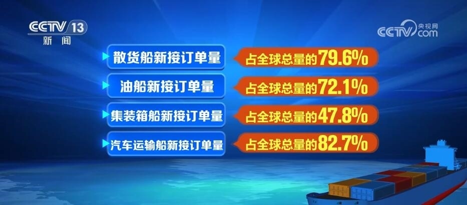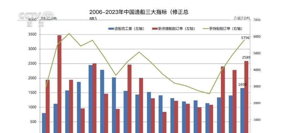 總臺央視記者 吳天白:在2023年中國造船業(yè)統(tǒng)計數據中,我們還可以看到三大指標占國際市場份額分別是50.2%、66.6%和55.0%,首次全部超過50%。