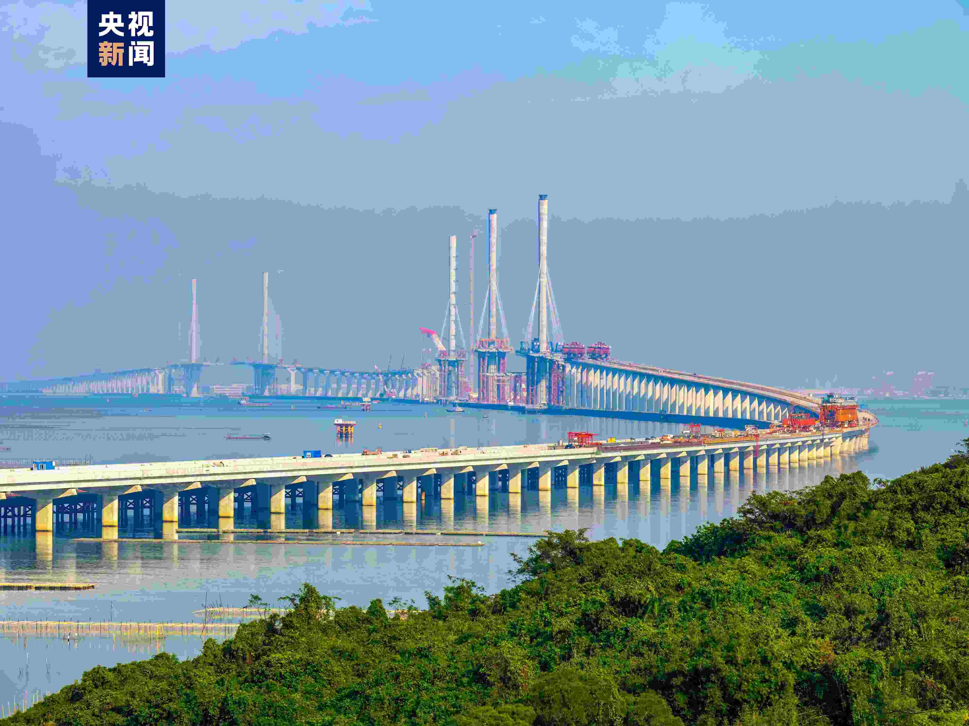 截至目前,黃茅??绾Mǖ赖奈遄魉蛢勺淼谰呀ㄔO(shè)完成,上部結(jié)構(gòu)施工持續(xù)進(jìn)行中,黃茅海大橋東塔鋼箱梁架設(shè)完成5節(jié)、中塔鋼箱梁架設(shè)完成9節(jié)、西塔鋼箱梁架設(shè)完成15節(jié);高欄港大橋東塔鋼箱梁架設(shè)完成31節(jié)、西塔鋼箱梁架設(shè)完成33節(jié)。