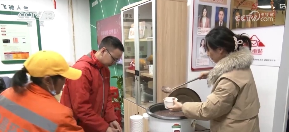 在湖北武漢武昌區(qū)一家工會(huì)驛站里,工會(huì)組織和街道也專門為外賣員、快遞員和環(huán)衛(wèi)、城管工作人員等戶外勞動(dòng)者們,熬制了一大鍋臘八粥。