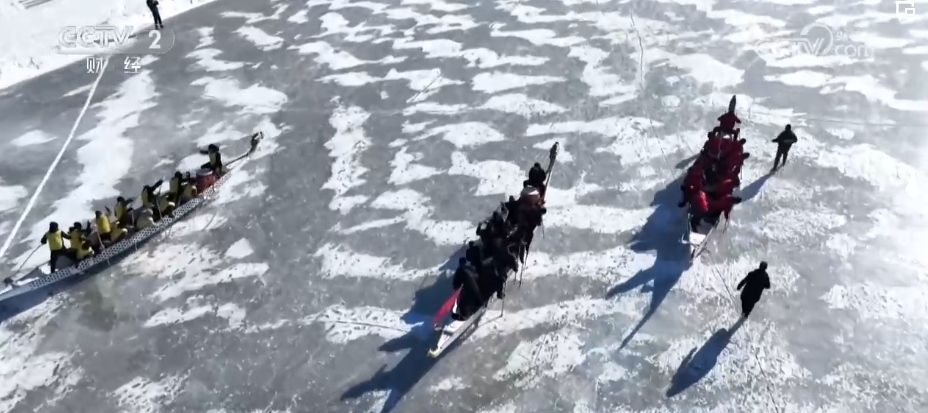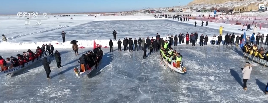 當(dāng)天下午2時,在烏倫古湖已經(jīng)封凍的湖面上,隨著裁判的一聲令下,冰上龍舟比賽開始了,選手們揮舞著冰杖在冰面上激烈角逐。
