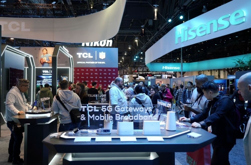 2024年1月11日,人們在美國拉斯維加斯消費電子展上參觀TCL公司(左)和海信公司(右)展臺。新華社記者 吳曉凌 攝