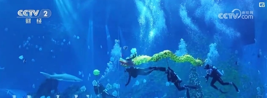 在鄭州一家海洋主題公園,4名潛水員化身“舞龍高手”,伴隨著他們的一招一式,一條金龍?jiān)谒序v挪起伏,向人們傳遞萬(wàn)物生輝的新春祝福。