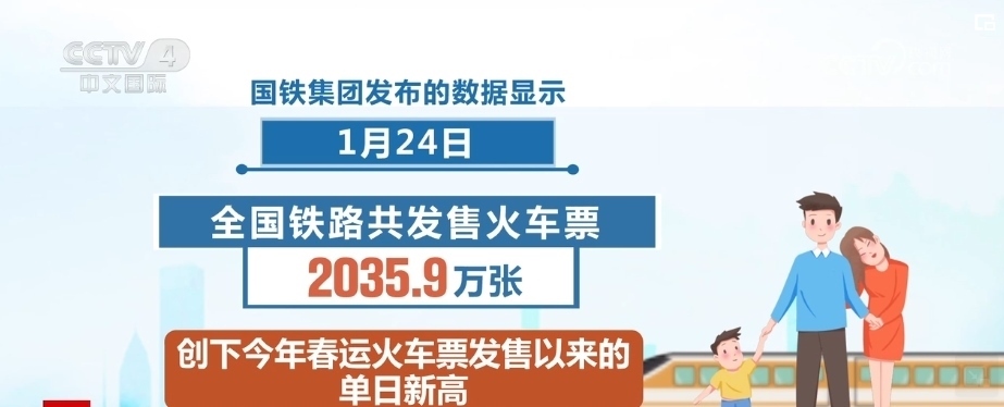 國鐵集團發(fā)布的數(shù)據(jù)顯示,1月24日,全國鐵路共發(fā)售火車票2035.9萬張,創(chuàng)下2024年春運火車票發(fā)售以來的單日新高,這標志著節(jié)前售票高峰已經(jīng)到來。