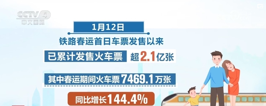 自1月12日鐵路春運首日車票發(fā)售以來,已累計發(fā)售火車票超2.1億張。其中,春運期間火車票7469.1萬張,同比增長144.4%。為滿足旅客旺盛的出行需求,全國鐵路統(tǒng)籌新線與既有線路、高鐵與普速鐵路,啟用春運列車運行圖,加大客運能力投放。